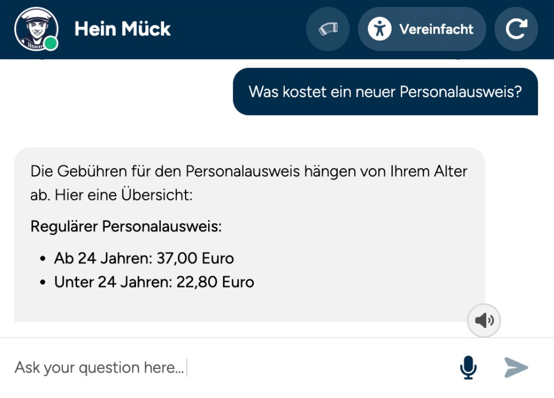 Der interaktive Chatbot macht Ihre digitalen Services für alle zugänglich. Nutzer können ihre Fragen einsprechen, die Antworten sind kontextbezogen und verständlich, werden auf Wunsch vorgelesen oder in leichter Sprache formuliert. Screenreader-kompatibel. So erreichen Sie auch Bürgerinnen und Bürger, die mit klassischen digitalen Angeboten nicht gut klarkommen.