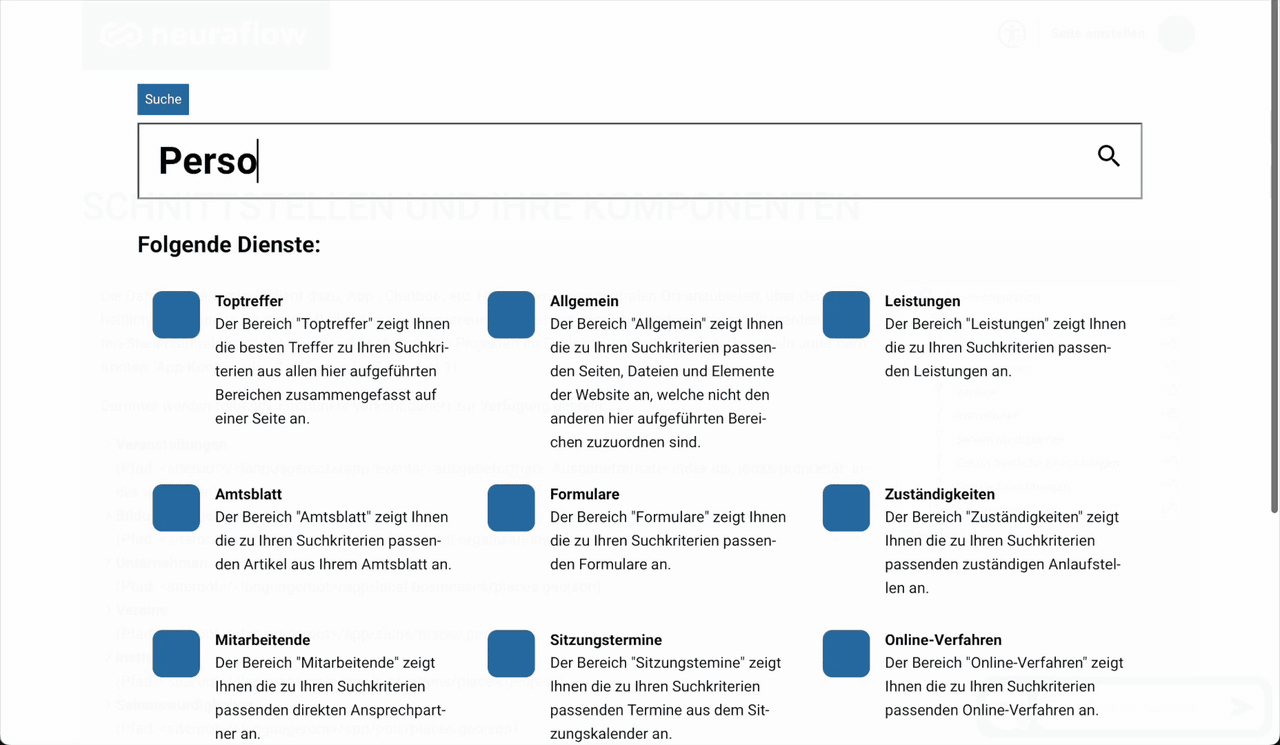 Die neue KI-gestützte Suchleiste befindet sich derzeit in der Einführung. Ob und wie schnell eine Integration auf Ihrer kommunalen Website möglich ist, hängt vom eingesetzten CMS ab. Derzeit sind wir mit verschiedenen Anbietern im Gespräch, ein erstes Partnerprojekt läuft mit dem CMS-Anbieter Chamaeleon.